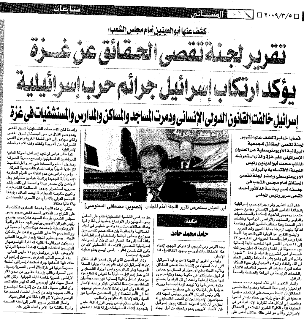 أعلن محمد أبو العينين، رئيس لجنة الشئون الاقتصادية والمالية بالجمعية البرلمانية الأورومتوسطية وعضو لجنة تقصي الحقائق التي شكلتها الجمعية للتحقيق في جرائم الحرب الإسرائيلية على غزة، أنه سيكتفي في إطار عضويته للجنة تقصي الحقائق بالزيارة الميدانية لقطاع غزة، ثم زيارة الضفة الغربية للاجتماع مع الرئيس الفلسطيني ورئيس الوزراء الفلسطيني، بدون المشاركة في زيارة اللجنة لإسرائيل.