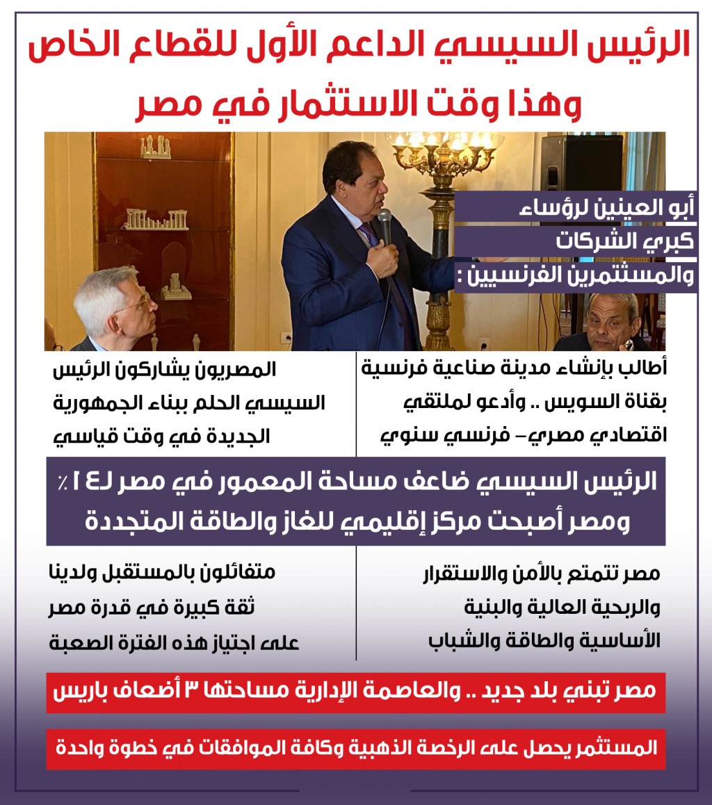 وخلال كلمته رحب أبو العينين برؤساء الشركات والمستثمرين الفرنسيين في بلدهم الثاني مصر، مؤكدا أن الرئيس عبد الفتاح السيسي حقق إنجازات ضخمة على المستويين الداخلي والخارجي وأن مصر قدمت خلال السنوات الـ9 الماضية نموذجا يحتذي به في استعادة الاستقرار والمضي قدما في طريق التنمية في ظل عالم تضربه الأزمات المتتالية .