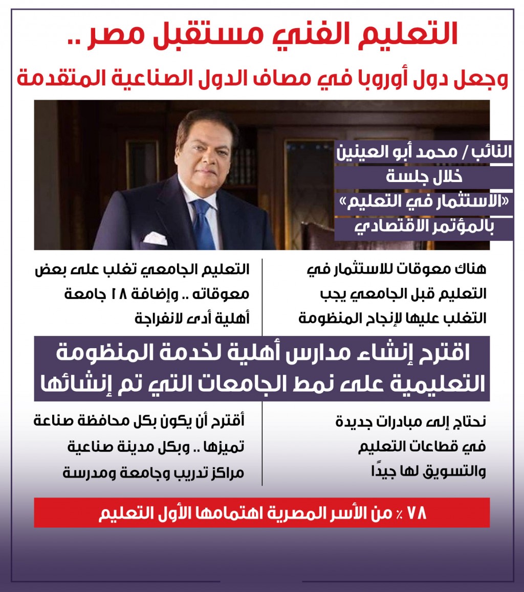 وتطرق رجل الاعمال محمد أبو العينين إلي التعليم الفني ومتطلباته لافتا أن جميع الدول بها تعليم فني صناعي لبناء دولة صناعية مثل ألمانيا لافتا أن التعليم الفني بالدول الأوروبية جعلها في مصاف الدول المتقدمة مشيراً إلي أن كل الدول الصناعية بها تخصصات ترمز لهذه الدول، لذلك اقترح أن يكون في كل محافظة صناعة تميزها مثل الأثاث في دمياط وأن يكون في كل مدينة صناعية مركز تدريب وجامعة ومدرسة.