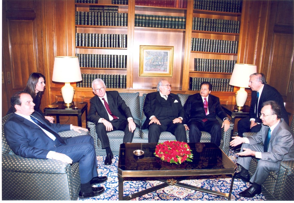 النائب محمد أبو العينين رئيس اللجنة الاقتصادية والمالية والاجتماعية بالبرلمان الاورومتوسطى مع رئيس البرلمان الاوروبى ورئيس وزراء اليونان ورئيس برلمانى تونس واليونان فى أعقاب اجتماع هيئة مكتب البرلمان الاورومتوسطى باليونان 2008 jpg.