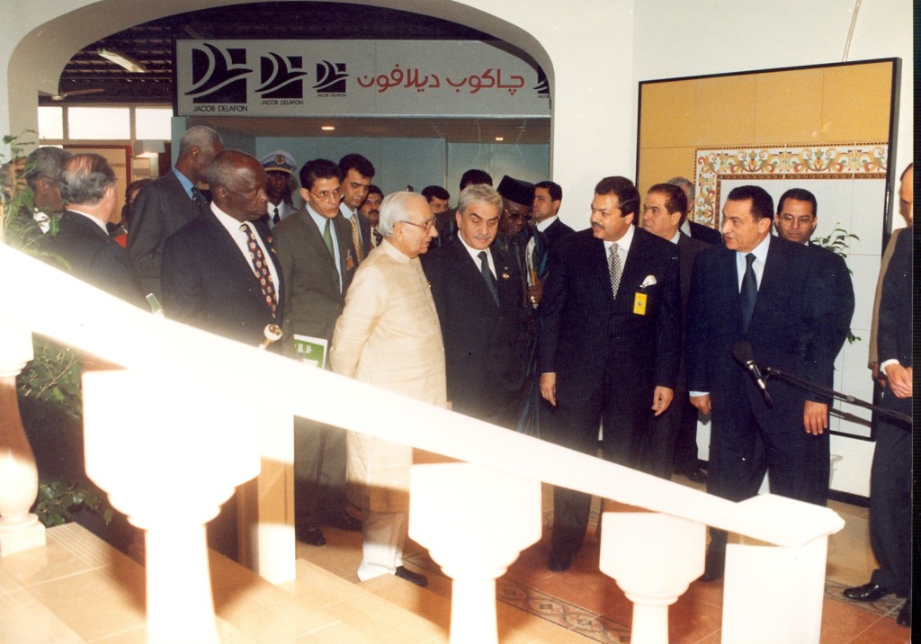 السيد محمد أبو العينين رئيس مجلس إدارة مجموعة يرحب برؤساء دول مجموعة ال 15 خلال زيارتهم لجناح مجموعة كليوباترا على هامش قمة دول مجموعة ال 15 التى عقدت فى ماليزيا عام 1997