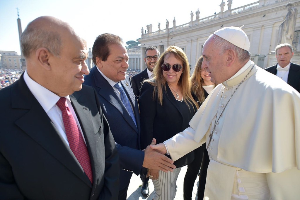 His Holiness Pope Francis welcomes Mr. Mohamed Abou El-Enein, Honorary President of the Euro-Mediterranean Parliamentary Assembly and the Egyptian delegation, following the Pope's declaration of his blessing to the path of the Holy Family trip to Egypt